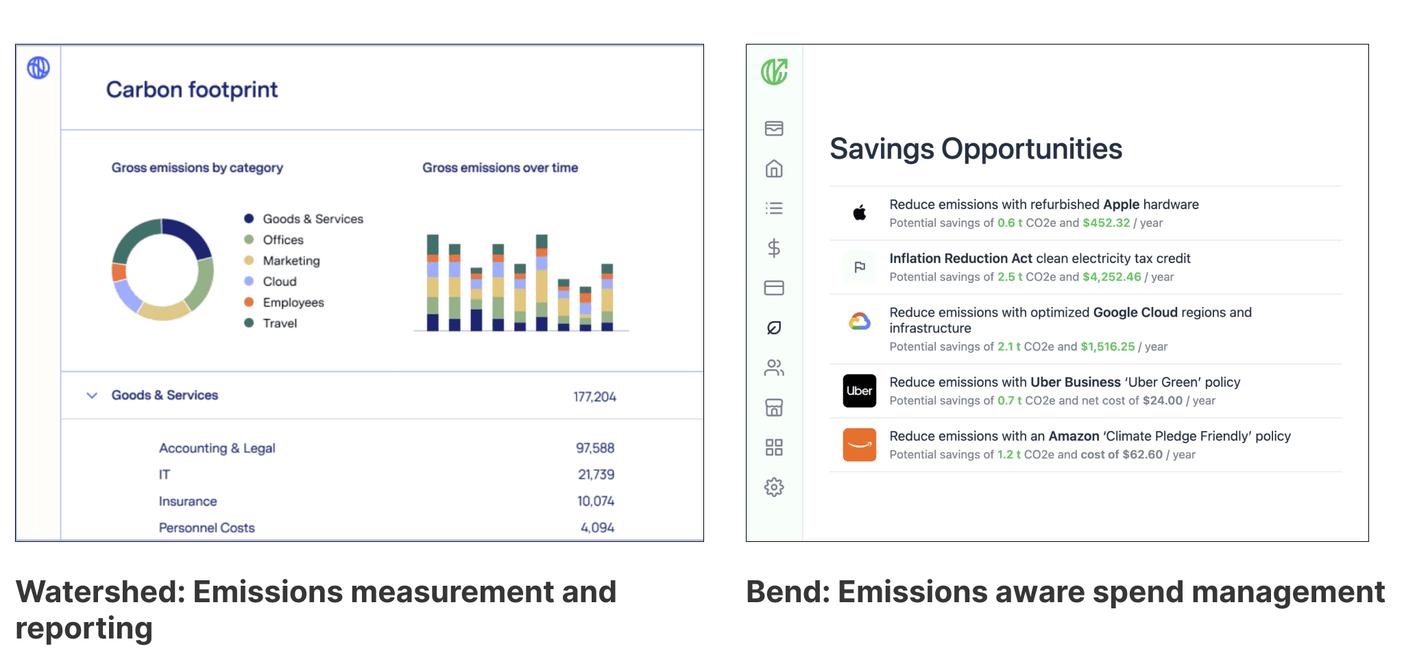 Examples: Watershed helps businesses report and analyze emissions. Tangible Materials helps building developers improve their practices. Climate Club encourages employee behavior change to reduce emissions. Bend augments a corporate card with emissions tracking. Lumen Energy enables building owners to profile their buildings and plan upgrades.