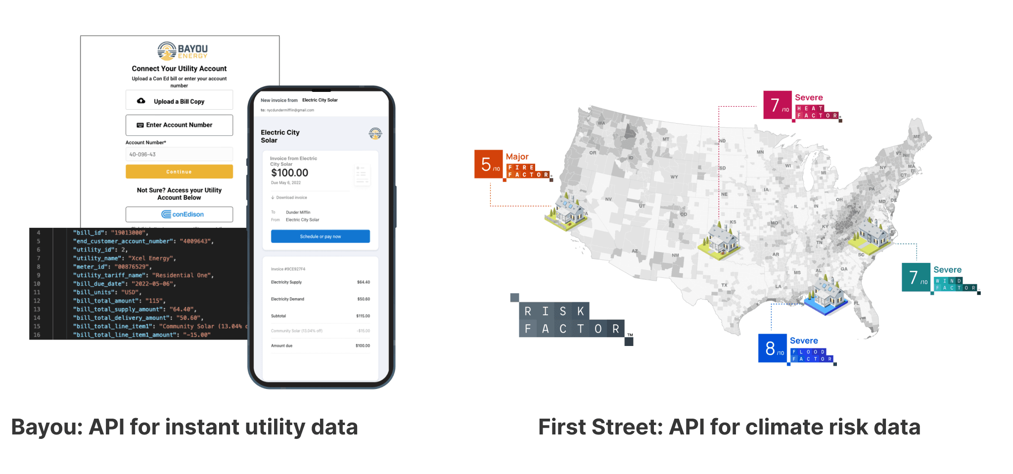 Examples: Bayou Energy is building a utility data API with instant data and onboarding. Eli.build is building an incentive data API and UI components for municipalities. The First Street Foundation (non-profit) gives API access to a hyper-local climate risk model that is used by governments, lenders, and consumers. Enode builds an API to connect to any energy device and build smart controls (e.g. smart EV charging). Farm builds a data-rich tool to help farmers find regenerative-friendly land.