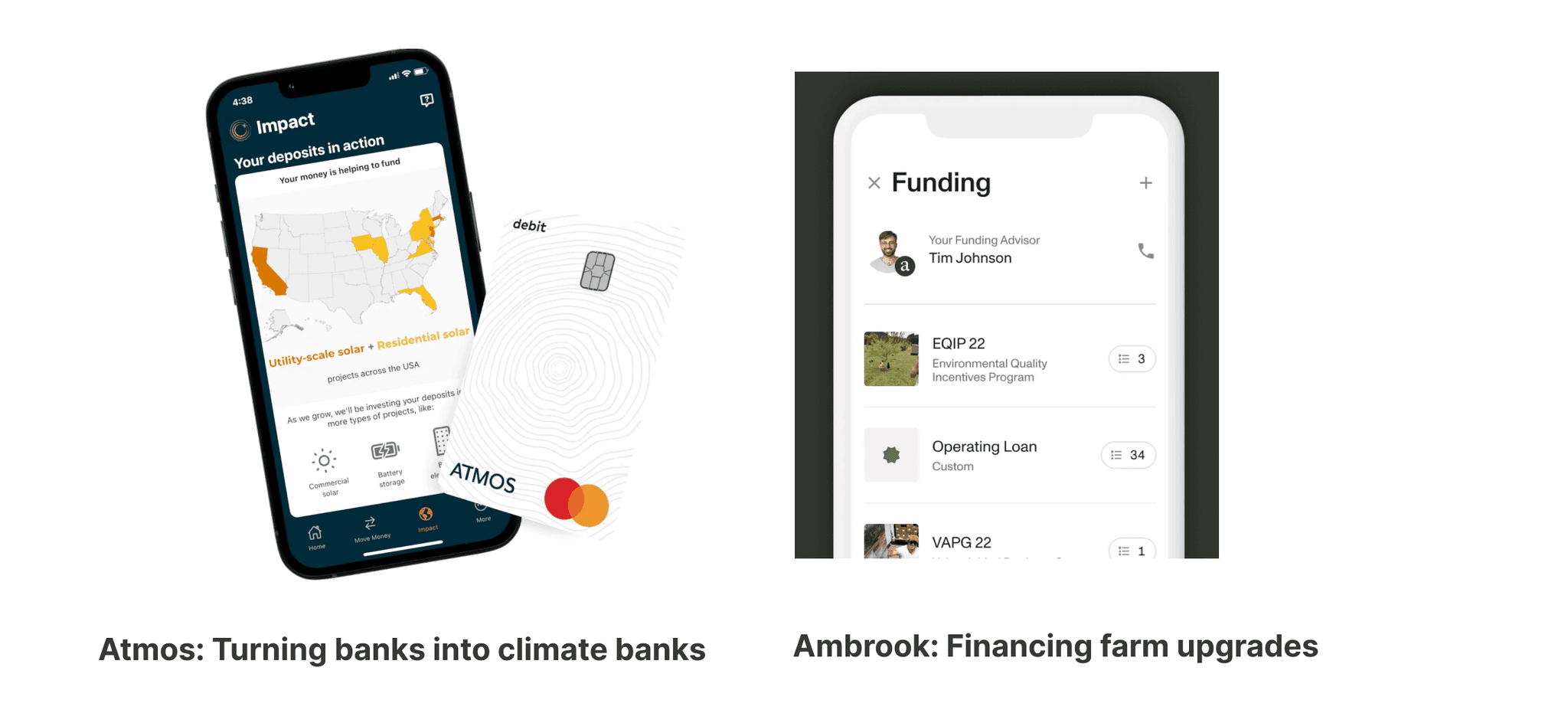 Examples: Atmos Financial helps banks finance residential solar projects. Allectrify helps banks and municipalities finance small to medium sized commercial projects. Mosaic offers financing through contractors; some ex-Mosaic folks founded a startup studio focused on fintech x climate called Ezra. Ambrook connects farmers to funding opportunities, and Steward allows them to raise crowdsourced funding.